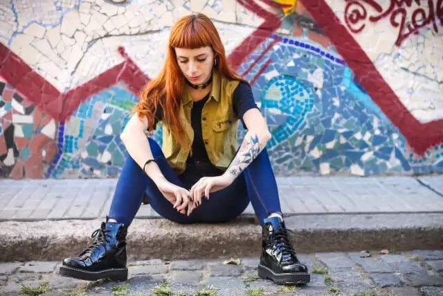 走了很多路,娇娇嫌脚累,坐在长椅上不走了。