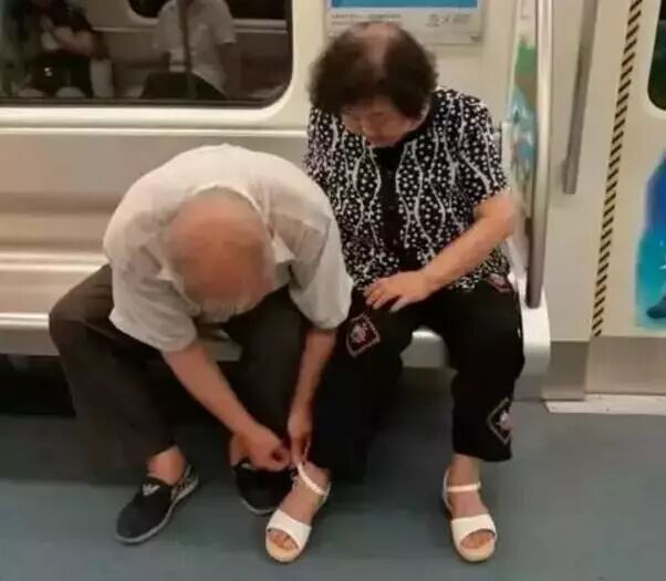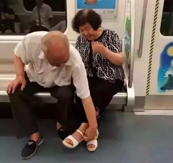 地铁上的一幕:一位老奶奶的鞋子坏了,老伴帮她修好后,细心地帮她穿上。
