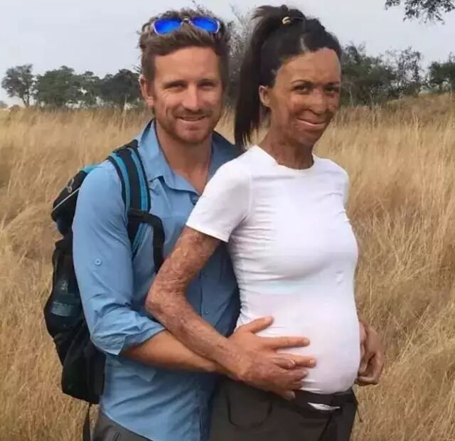 烧伤的模特Turia与其丈夫Michael庆祝其怀孕,两人戳气球蹦蹦跳跳地像个孩子。