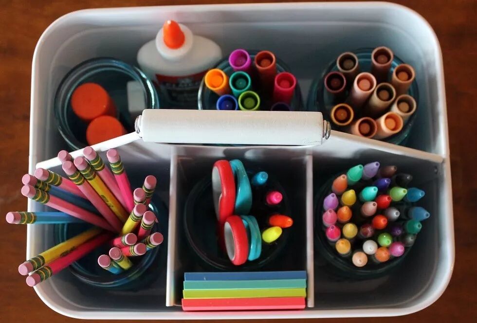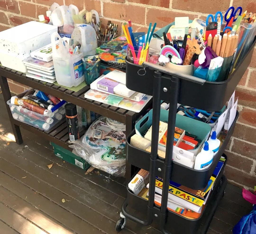 艺术角不需要很大的空间,房间的一角,或者一张桌子、一个小推车,哪怕一个小抽屉都是没有问题。把各种各样的绘画材料、手工材料,甚至孩子和家长都觉得有意思很好看的日常用品,捡来的树枝树叶都集中放在这里。