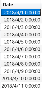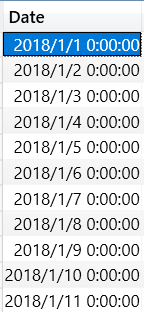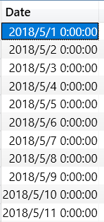 返回的结果是从2018/1/1-2018/5/31的日期列表;如果是DatesQTD则返回2018/4/1-2018/5/31;如果是DatesMTD则返回2018/5/1-2018/5/31