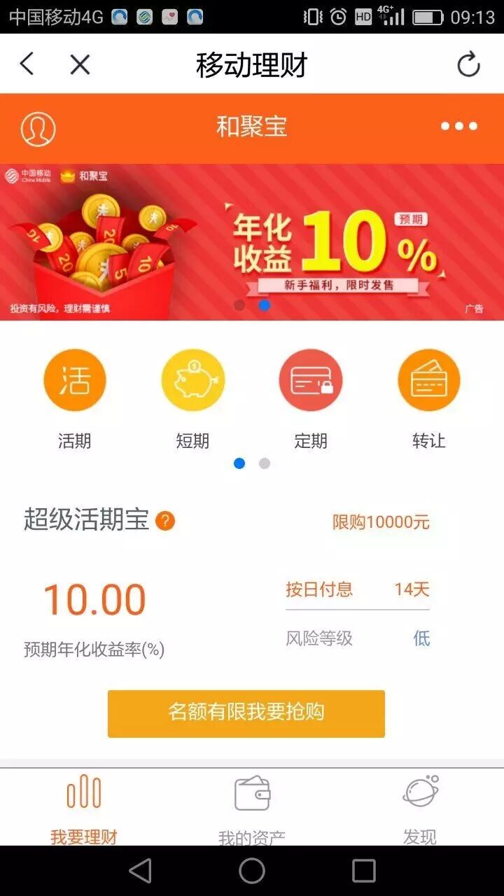 1月19日作者第一次注意到移动掌上营业厅还有一个理财平台。当天开放超级活期宝,年化利率10%,限购1万,作者犹豫了一下,最终决定买了,点进去一看,已经卖完了。