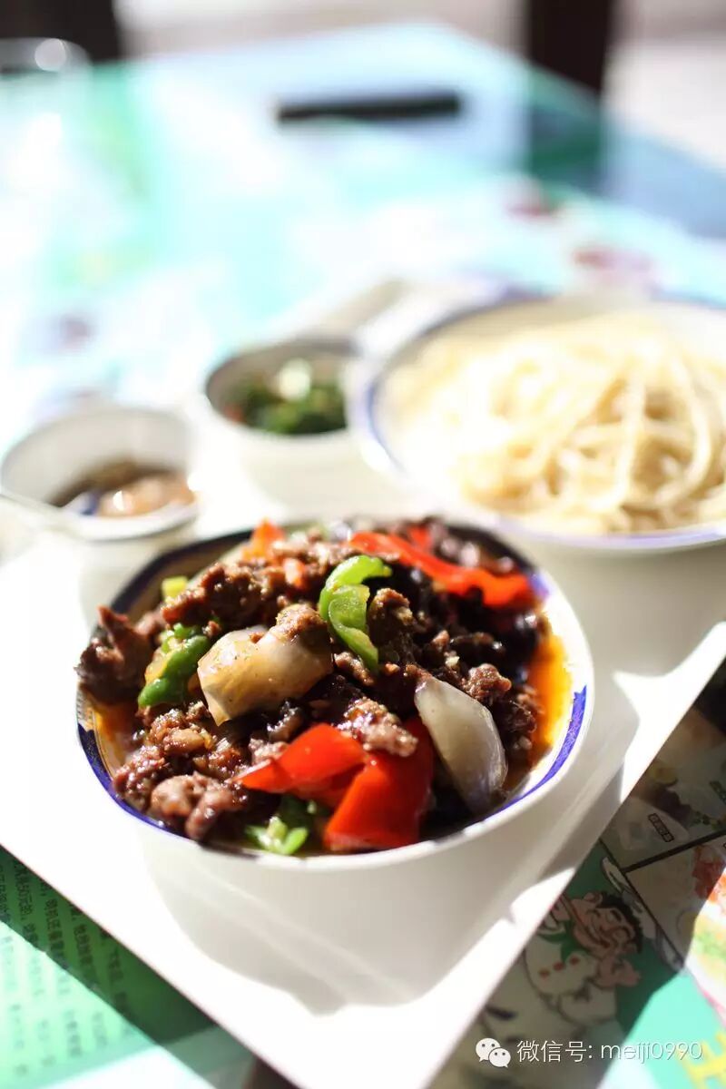 吃过那么多拌面,想必大家都知道“过油肉拌面”在拌面界的地位吧,不用说一定是最高等级的。用提前腌制好的牛肉,经过油煎,再与彩椒、木耳、番茄同炒,搭配洋葱和小葱花,让整个浇菜颜色鲜亮,食欲倍增。将炒好的配菜倒至面中,充分搅拌,菜汁浸入面里,咸香诱人。这时你再小家碧玉就没有大快朵颐来的痛快了,店家特制的酿韭菜和油泼蒜泥一定要放一点一起拌入面中,用筷子连肉、彩椒、木耳等一并挑入口中,蒜香将肉味充分化解开,肉块浓郁多汁,番茄的酸爽和青椒的清甜与香甜滑韧的白面一起舞做一曲曼妙的华尔兹,成为午餐中耀眼的盛宴。吃到五分饱,想让浓郁的气息不要太猛烈的话,完全可以来一壶回民特有的三炮台茶(冬天)或回民凉茶(夏天),淡淡的香甜十分解腻。