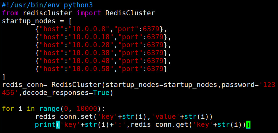 [root@redis-node1 ~]#vim redis_cluster_test.py[root@redis-node1 ~]#./redis_cluster_test.py[root@redis-node1 ~]#redis-cli -a123456-h10.0.0.8Warning: Using a password with '-a'or'-u' option on the command line interface may not be safe.10.0.0.8:6379> dbsize