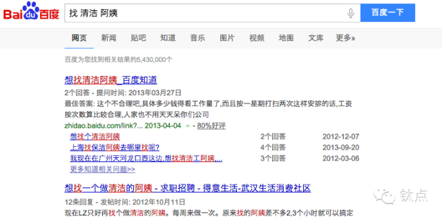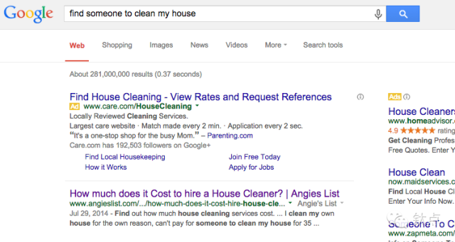 以下是假设我需要找个人清洁房子,分别在Google和百度上搜索的结果: