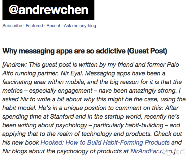 这类里面我印象最深的就是Andrew Chen的博客上的客座稿件,因为——实际上我就是看了那些文章才决定关注他的博客的。
