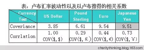 注:卢布汇率波动性的得出是依据直接标价法,一单位的外币(除日元为100¥)能够兑换到多少单位的卢布;以卢布为基础所推得的美元相对于英镑、欧元、日元的相关系数,COV($,¥)表示美元与日元的相关系数。