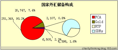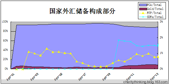 注:FCA为Foreign Currency Assets的缩写,代表外汇货币资产;RTP为Reserve Tranche Position的缩写,代表储备部分提款权,即成员国以外汇储备资产向IMF认缴其份额的25%部分;Total=FCA+Gold+RTP+SDRs,即国家外汇储备总额。最后一图,显示了双坐标,主要是由于RTP和SDRs两者在Total所占比例过小,不易清除地在左边竖坐标展示。