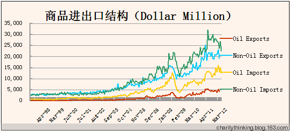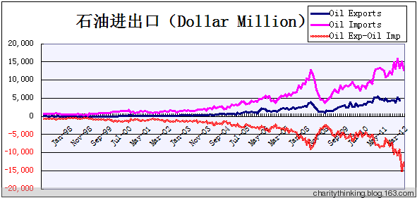 注:Oil Exports代表石油产品的出口,Oil Imports代表石油产品的进口,Oil Exp-Oil Imp代表石油产品进出口入超(Oil Exp-Oil Imp<0)或出超(Oil Exp-Oil Imp>0)趋势。