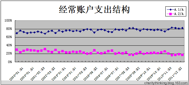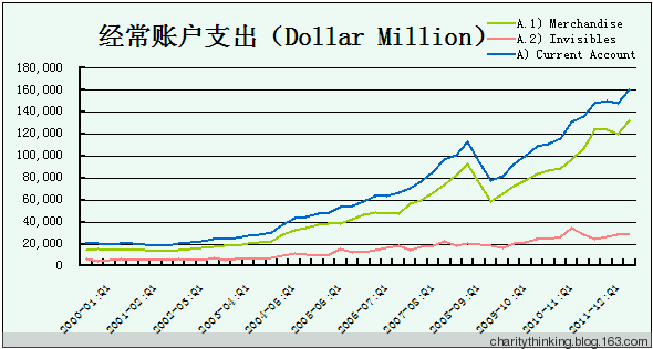 注:此处之所以用“经常账户支出”,是想与“经常账户收入”形成对照,也就是常说的经常账户借方余额,表明本国对他国货物以及服务的进口需求。注:A.1) Merchandise为形货物的进口,A.2) Invisibles为无形的服务进口,A) Current Account为经常账户的进口总支出。