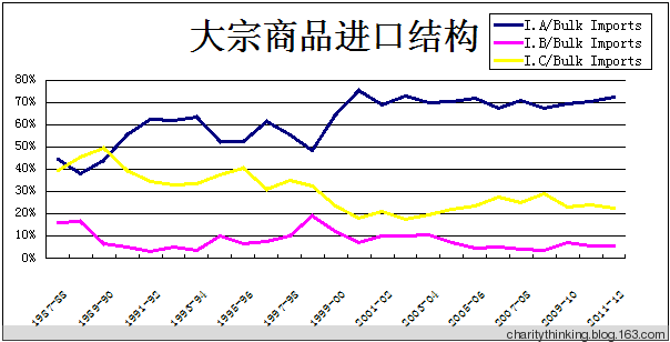 注:I.A代表I.A Petroleum, Crude and Products石油、原油和相关产品, I.B Bulk Consumption Goods大宗消费品,I.C Other Bulk Items其他大宗产品。I.A/Bulk Imports表示石油、原油和相关产品的进口在总的大宗产品进口中所占的比重,其他的类似。