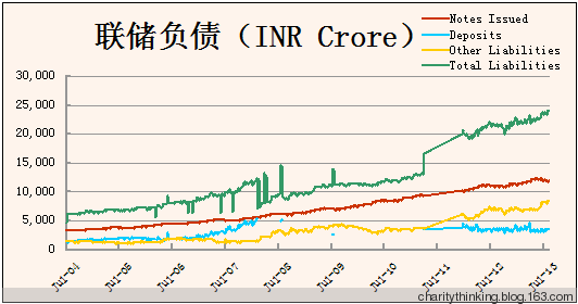 注:以上如无特别说明,联储负债/资产数额均以Crore即千万卢布计。Notes Issued即发行的货币,Deposits即政府、商业银行等在联储的存款,Other Liability即其他负债。
