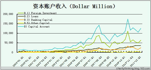 注:B.1) Foreign Investment为外国投资,包括B.1.a) Foreign Direct Investment外国直接投资与Portifolio Investment证券投资两部分;B.2) Loans为贷款包括B.2.a.1) External Assistance by India印度对外援助,B.2.a.2) External Assistance to India外国援助印度,B.2.c) Short Term Credit to India对印度短期信用贷款;B.3) Banking Capital为银行资本,包括a) foreign assets of commercial banks (ADs)商业银行的对外资本, b) foreign liabilities of commercial banks (ADs)商业银行的对外负债, and c) others.其他部分,B.5) Other Capital为其他资本主要是the leads and lags in export receipts出口订单签收在银行与税务部门间的日期不一致性所引起的款项在银行的滞留;B) Capital Account为资本账户收入。