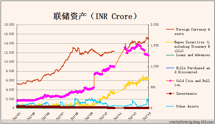 注:由于在联储资产构成中,除外汇货币资产( Foreign Currency Assets)与卢布标值的证券(Rupee Securities (including Treasury Bills))占比较大外,其他五类:联储贷款和预付( Loans and Advances)、购置的票据和兑的换未到期票据(Bills Purchased and Discounted)、黄金和白银(Gold Coin and Bullion)、投资( Investments)、其他资产(Other Assets)占比均较小,因此这五类资产时间序列图对应着右边的数轴。