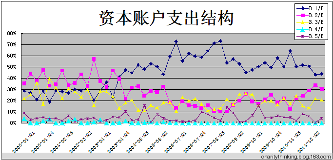 注:B.1/B表示B.1) Foreign Investment/B) Capital Account的比值,即外国投资在资本账户支出中所占的比重;B.2/B表示B.2) Loans/B) Capital Account的比值,即贷款在资本账户支出中所占的比重;B.3/B表示B.3) Banking Capital/B) Capital Account的比值,即银行资本在资本账户支出中所占的比重;B.5/B表示B.5) Other Capital/B) Capital Account其他资本在资本账户支出中所占的比重。