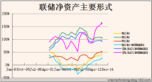 注:B1为联储对政府净债权,D1为联储掌管的净外汇资产,F1为联储非货币形式负债,A1为联储净资产(联储资产—联储非货币形式负债=联储负债),AVERAGE1、AVERAGE2、AVERAGE3分别为联储公布的连续634周A1、B1、D1、F1具体数据而得到的B1/A1、D1/A1、F1/A1三种百分比的平均值。