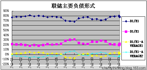 注:B1为流通中的货币,D1为银行在联储的存款,E1为联储的负债(B1+D1部分占据了99%)。据联储公布的连续634周数据,得到B1/D1的平均值即AVERAGE1、D1/E1的平均值即AVERAGE2分别为75.2%、24.0%。B1/E1-AVERAGE、D1/E1-AVERAGE主要是突出联储这两部分负债的波动性。根据联储的资产负债统计等式得知,此处联储只要负债形式为货币形式的负债,而联储非货币形式的负债并不在统计之内。