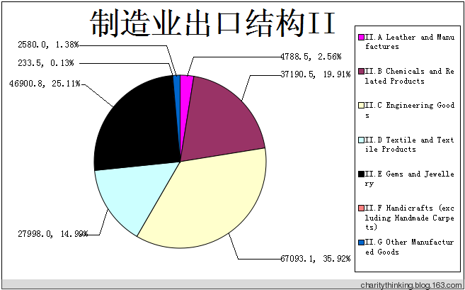 注:II.A为II.A Leather and Manufactures皮革制造业产品,II.B为II.B Chemicals and Related Products化工产品,II.C为II.C Engineering Goods工程产品,II.D为II.D Textile and Textile Products纺织产品,II.E为II.E Gems and Jewellery珠宝产品,II.F为II.F Handicrafts (excluding Handmade Carpets)除手工造地毯之外的手工艺产品,II.G为II.G Other Manufactured Goods其他制造业产品,Total Manu为II. Manufactured Goods制造业产品。II.A/Total Manu表示皮革制造业产品在整个制造业出口产品中所占的比重,其他的类似。
