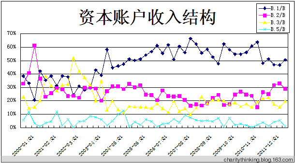 注:B.1/B表示B.1) Foreign Investment/B) Capital Account的比值,即外国投资在资本账户收入中所占的比重;B.2/B表示B.2) Loans/B) Capital Account的比值,即贷款在资本账户收入中所占的比重;B.3/B表示B.3) Banking Capital/B) Capital Account的比值,即银行资本在资本账户收入中所占的比重;B.5/B表示B.5) Other Capital/B) Capital Account其他资本在资本账户收入中所占的比重。