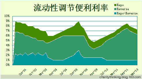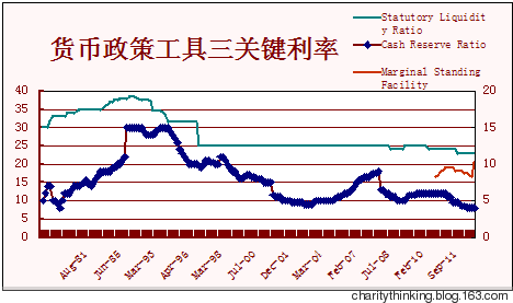 注:Bank Rate为银行贷款利率;Repo为正回购利率,Reverse为逆回购利率,两者构成流动性调节便利(Liquidity adjustment facility (LAF) )政策工具的核心;Statutory Liquidity Ratio为联储规定的各商业银行应该持有以黄金、政府债券等能迅速提供流动性的资产,以有力应对储户等的大额用款需求,防止发生流动性危机进而引起信用危机;Cash Reserve Ratio为存款准备金,是联储规定的需要将储户储存的款项的一部分交到各商业银行在联储开设的专属账户;Marginal Standing Facility为边际贷款便利,是联储2011年新规定的一种及时提供流动性的新方式。