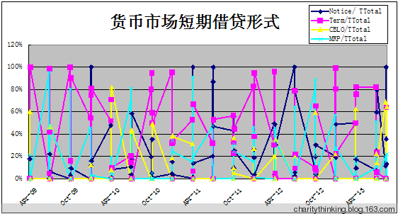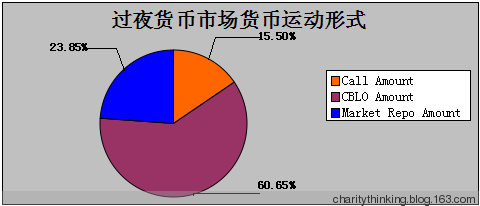 注:Call为银行间过夜借贷形式;CBLO为Collateralized Borrowing And Lending Obligation的缩写,代表借贷双方将抵押物交予第三方托管的借贷形式,有过夜借贷与短期借贷二种形式;Market Pro为借贷双方间以回购证券的形式开展借贷;Notice Money为2—14天的短期借贷;Term Money为15—1年的短期借贷;表中CBLOt代表短期CBLO,Prot嗲表短期Pro;图中OTotal为Overnight Total Money的简写,TTotal为Term Segment Total Money的简写。过夜货币市场与短期货币市场最大的区别在于过夜货币市场的货币资金借贷活动往往在一天之中完成。