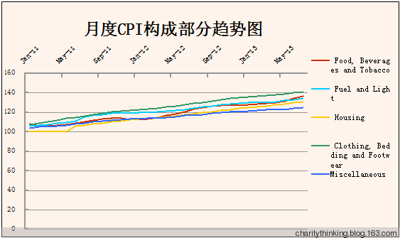 注:在印度统计数据中,CPI主要有四部分构成,分别是Food,Beverages and Tobacco即食物、饮料、烟草,Fuel and Light即燃料和电力,Housing即住房,Clothing,Bedding and Footwear即衣服、寝具、鞋类,Miscellaneous即包括娱乐、教育等在内的其他类。CPI还根据农村Rural与城市Urban的地域差异,制定了Rural CPI与Urban CPI,分别反映农村地区与城市地区的居民生活成本。所有CPI都是以100为基准点,高于100代表生活成本处于上升趋势。