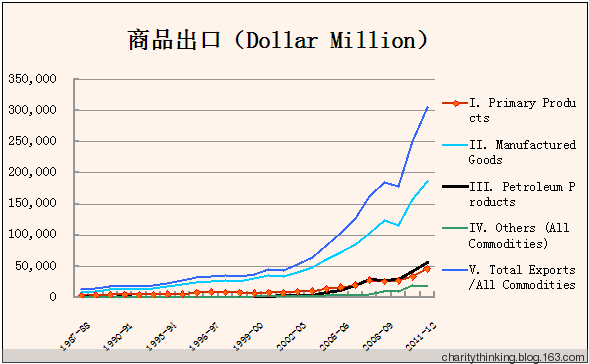 注:I.Primary Products为初级产品出口,II. Manufactured Goods为制造业产品出口,III. Petroleum Products为石油天然气产品出口,IV. Others (All Commodities)为其他产品出口,V. Total Exports/All Commodities为商品总出口。