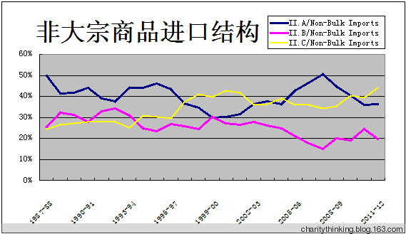 注:II.A代表II.A Capital Goods资本性产品,II.B代表II.B Mainly Export Related Items主要出口相关项目产品,II.C代表II.C Others其他非大宗商品。II.A/Non-Bulk Imports表示资本性产品的进口在总的非大宗产品进口中所占的比重,其他的类似。