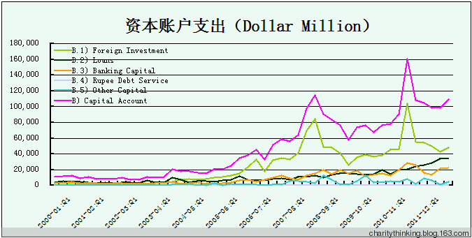 注:与“资本账户收入时间序列图”所示的标注意思一致,正如FDI外国直接投资是双向的,印度的企业、银行、国民也会将资本投资到国外追求高于国内平均利润的资本回报率。