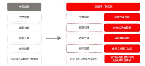 传统企业IT 的“互联网+”转型中,云化IT 基础架构的引入,也导致IT 运维场景的变迁。将纷繁复杂的运维 任务变得从复杂到简单、从无序到有序、从非标准到标准和流程化。