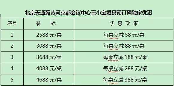通过喜小宝预订北京天通苑黄河京都会议中心的新人,将会得到如上图的优惠: