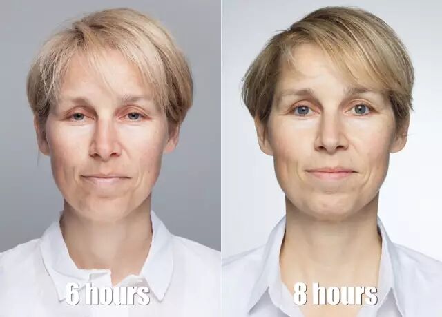 国外就有一个关于睡眠的研究,研究对象是一个46岁的英国女性。看看一周平均每天睡6小时,和每天至少睡八小时的对比。左边眼睛明显凹进去了,皮肤光泽感也很差,脸看起来肿肿的。右边则容光焕发了许多。