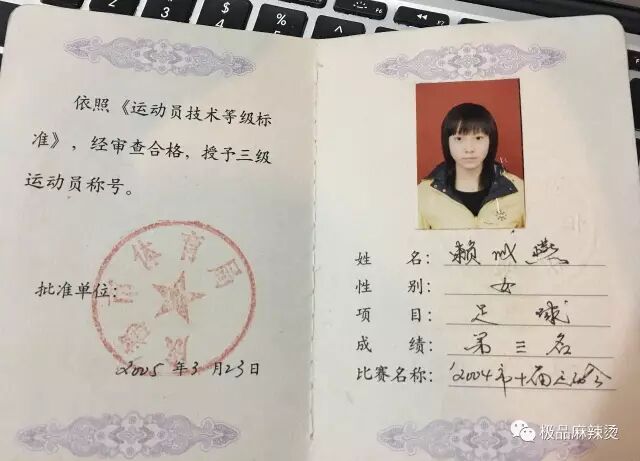 初中的时候,因为很喜欢贝克汉姆,又刚好遇到学校女子足球队在招新队员,我凭着在校运动会中拿了1500米长跑第一名入选。从那时候开始我每天下午都参加训练,夏天被晒掉一层皮,淋着大雨在球场上奔跑都是常事。初三那年我们在市级比赛中拿了第三名,我因此被评为了"国家三级运动员"。这一次,我还是被认为是运气好。