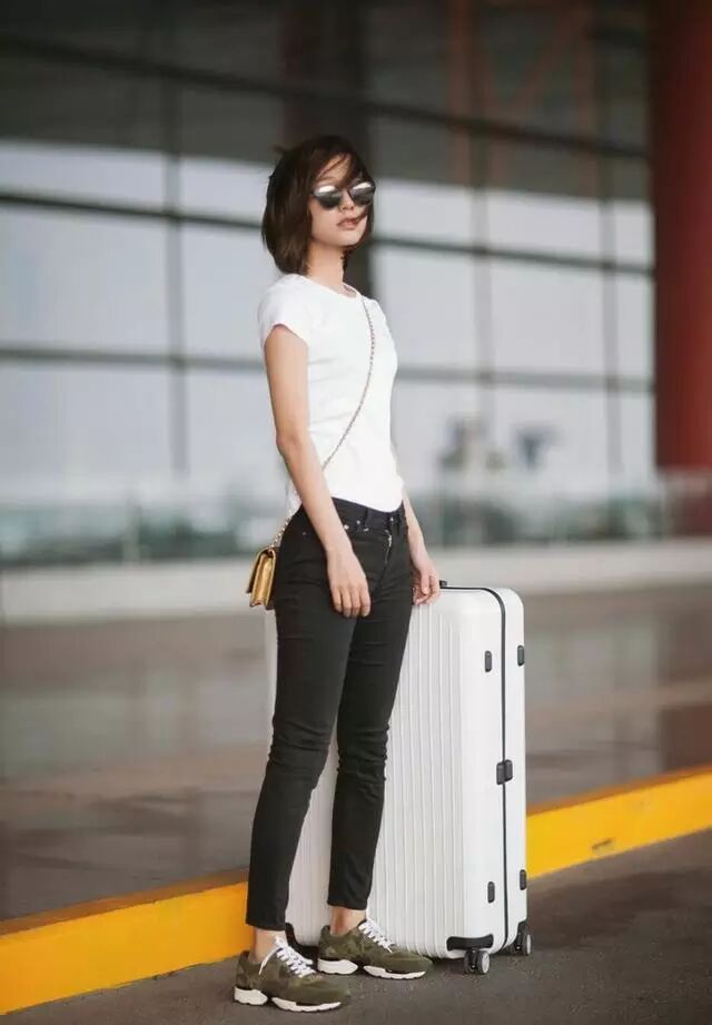 机场这样穿件白T恤,下搭黑色紧身裤和一双有格调的迷彩运动鞋,轻松HOLD住休闲时尚范。