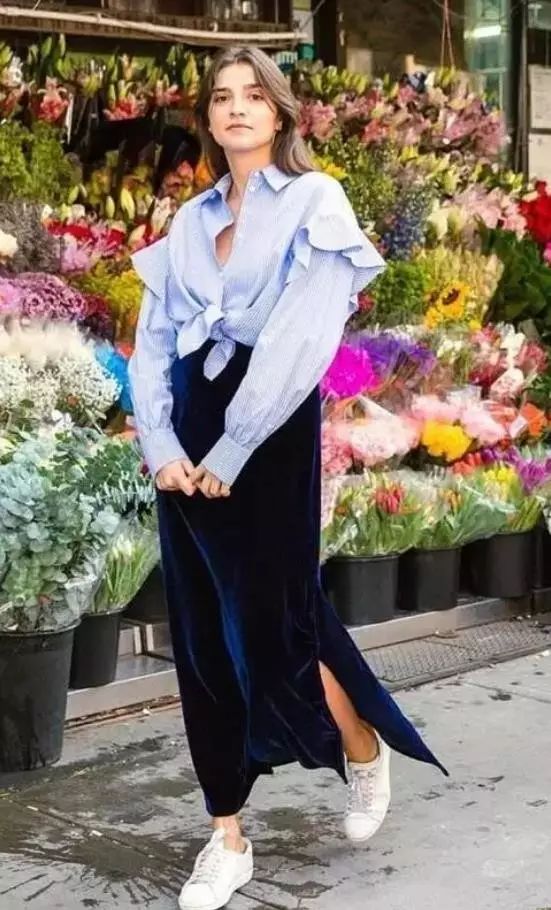 其实秋天,衬衫+长裙的穿法是显高的