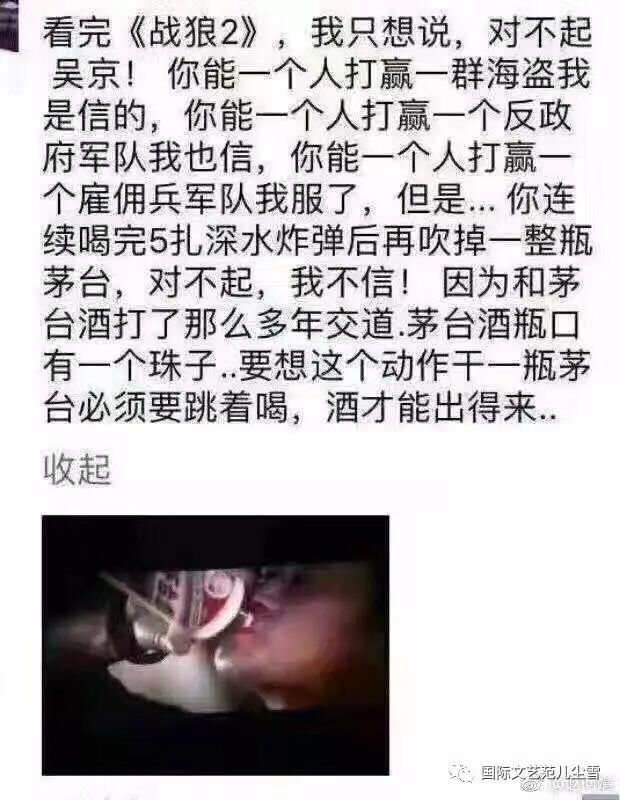 对片中的一些“出戏”的细节,网友也纷纷吐槽。一位网友在朋友圈写道:“对不起吴京!你能以一人打赢一群海盗我是信的,但是你连续喝完5扎深水炸弹后再吹掉一整瓶茅台,对不起我不信!因为和茅台酒打了那么多年交道,茅台酒瓶口有一个珠子——要想这个动作干一瓶茅台必须要跳着喝,酒才能出得来。”