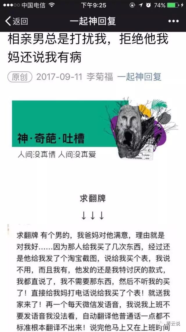 在女孩和相亲男聊得不是很愉快的时候,他爸妈还说是女孩的问题,“你这么大个人了有个人就不错了”说的女孩一无是处