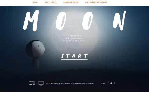 Moon这个脑洞大开的网页曾得到许多设计师的盛赞。设计师以讲故事的形式来呈现尖锐的社会问题,巧妙地让可爱的艺术感染力同人文关怀充分结合到一起,发人深省。