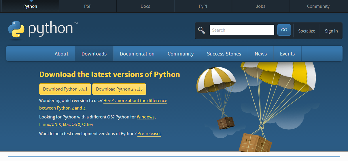 打开官网: https://www.python.org/downloads/ 目前官网上已经更新到3.6.1啦,有两个版本,大家可以按自己喜欢的去下载,我自己选择的是Python3.5,语法对比2.7版本的会有些改进,用2.7版本的小朋友贴我的代码是会报错的哦!