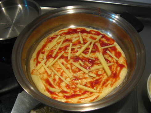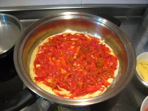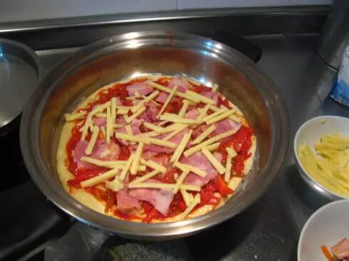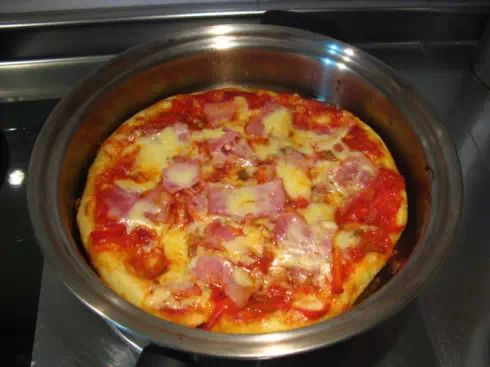 做法:锅底涂黄油,将面团擀圆铺在煎炒锅中,用叉子表面叉洞,在面饼上涂上一层番茄沙司及黑胡椒粉。然后铺上一层奶酪。将馅料铺在奶酪上面,在馅料上面再加上一层奶酪。用中小火加热约20分钟至底部呈金黄色就可以了。