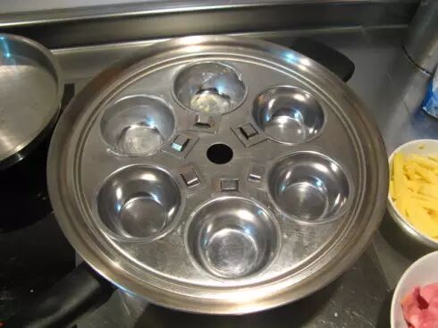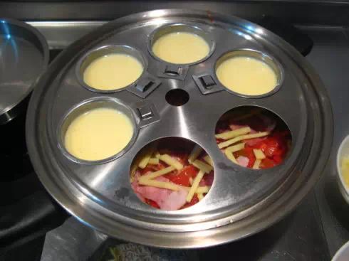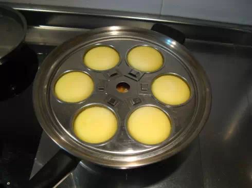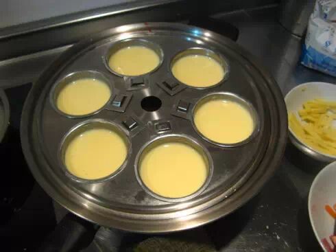 放钢杯(钢杯里倒上拌匀的蛋糕液)