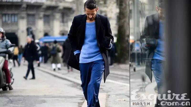作为全球最敢穿的男士,Simone Marchetti一贯大胆出位的色彩驾驭能力在街拍领域几乎所向披靡。阔腿裤这季简直时髦到不行,Simone 又一次显示了街拍大神的威猛,一条皇家蓝阔腿裤端的野心勃勃。为了看起来不像刚从床上爬起来的颓样,关键得保持上半身的硬朗气概,修身针织衫和版型利落的双排扣大衣组合,我们尤其赞赏朴实外观下色彩和面料的激烈冲突。当然没有穿阔腿裤的勇气换成修身版型也是另一种味道。