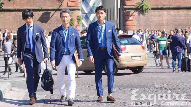 一周的出差你会带多少套装备?Pitti Uomo 街拍上的这三位绅士向我们展示了一套皇家蓝西服的延伸组合,只是适度的更换裤子和领带,日间开会报告、下午茶洽谈、酒吧小酌...统统搞定!虽然他们看起来好像是去享用一杯冰镇Prosecco而不是讲PPT,但不得不承认的是看起来专业和穿的时髦真的可以完美演绎!