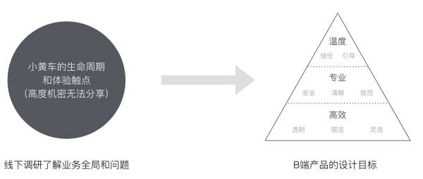 传统设计师对待B端产品可能认为就是体验非常差非常粗糙的OA产品,一般想招做B端的设计师对方都会万般不情愿。但是我们对B端产品转变思维后定了三个设计目标:底层是UI和交互的改造提升帮助整体的使用效率,而最顶层的“温度”目标则是希望一线师傅和运营在枯燥的重复工作中,能找到对城市出行的使命感和责任感,同时产生对小黄车大家庭的归属感。在这样的大目标下,B端的设计发挥空间就非常的大了,当然难度也非常的大,最终已经模糊了B端和C端的概念,而是在服务体验设计的范畴内。