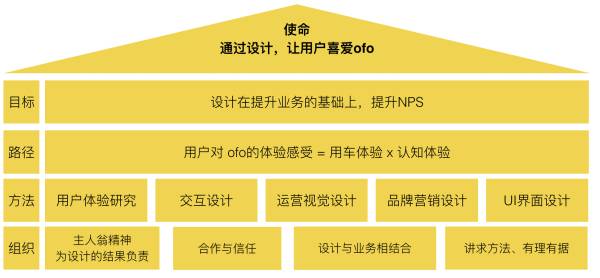这个是我们OXD团队(Ofo Experience Design)一起脑暴出来的战略图,大家围绕着初心思考了一下为什么要在 ofo做设计,希望做了几年之后得到的成就是什么,思来想去就是 “能够通过设计,让用户喜爱上ofo”。虽然这个使命很虚很抽象,但是我们基于这个使命拆解出很多具体的路径,比如: