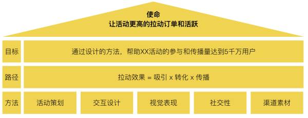 同样的方法我们也可以运用在某个具体的设计事务上,先有使命,然后基于使命去拆解目标和路径,方法等。但是我觉得这个使命最大的价值还是提升设计师的内驱力和格局观上,通过使命,你才能把自己把的更高格局更高,然后在做的过程中不纠结不设限。