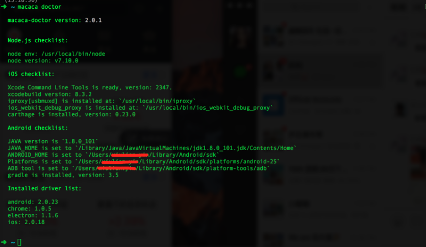 至此,便完成了完整的Macaca相关环境的安装,此时我们可以通过macaca doctor命令检查当前环境配置: