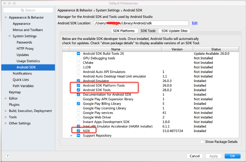 SDK Tools: Android SDK Platform-Tools && Android SDK Tools && NDK