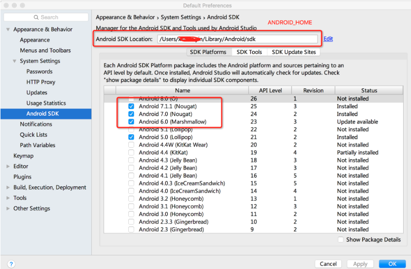 上面第一张图中红框标记的ANDROID_HOME地址是安卓SDK的路径,需要配置到环境变量中,配置方法同gradle一样