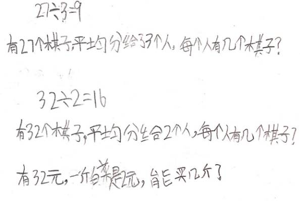 师:现在请你们自己先想一个除法算式,再为这个除法算式编一个故事。